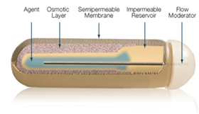 ALZET® Osmotic Pumps 是體積只有膠囊大小的滲透壓泵,符合 USP 醫(yī)療塑料膠材料生物相容性標(biāo)準(zhǔn),可植入實(shí)驗(yàn)動(dòng)物皮下或腹腔內(nèi),直接或通過(guò)導(dǎo)管以 ul/小時(shí)的速度緩慢持續(xù)準(zhǔn)確地送出測(cè)試藥劑。Alzet 緩釋泵由外到內(nèi)分為三層(如下圖所示),最外層是半透膜材料(Semipermeable Membrane),最內(nèi)層為不透水彈性材料制成的貯藥囊(Impermeable Reservoir),中間為高滲的鹽夾層(Osmotic Layer)。當(dāng)泵體被植入動(dòng)物體內(nèi)時(shí),由于滲透壓差迫使體液透過(guò)泵表面的半透膜流向高滲鹽夾層,擠壓貯藥囊,使藥物(Agent)按照預(yù)計(jì)速度經(jīng)導(dǎo)流管(Flow Moderator)釋放到動(dòng)物體內(nèi)。