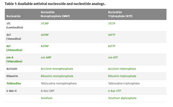 抗病毒核苷/核苷酸類似物可以通過(guò)抑制病毒復(fù)制的幾個(gè)關(guān)鍵過(guò)程來(lái)抑制病毒繁殖,它們通過(guò)與天然的dNTP/NTP競(jìng)爭(zhēng)結(jié)合到新的病毒核酸中,從而導(dǎo)致鏈終止或者誘變。在細(xì)胞培養(yǎng)實(shí)驗(yàn)中,可以用抗病毒核苷酸的非磷酸化核苷變體,這種核苷酸在細(xì)胞內(nèi)被多種病毒和/或宿主激酶激活,從而發(fā)揮(tri)磷酸化形式的抗病毒作用。