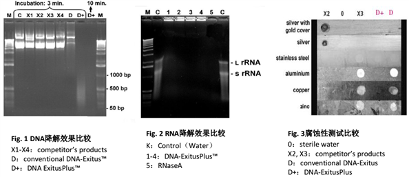 傳統(tǒng)的核酸污染清除多通過修飾、酶解(如DNase)或變性等幾種方式,實(shí)踐證明這些方式存在核酸降解不徹底、試劑具有腐蝕性和毒性等不足。德國AppliChem的DNA-ExitusPlus?(貨號A7089)是一種無腐蝕、無致癌性的核酸(包括DNA、RNA)清除試劑,該產(chǎn)品可斷裂雙鏈DNA并將其降解,且已降解的核酸片段不能被恢復(fù),從而能徹底消除PCR過程中由于非目標(biāo)DNA導(dǎo)致的假陽性擴(kuò)增。
