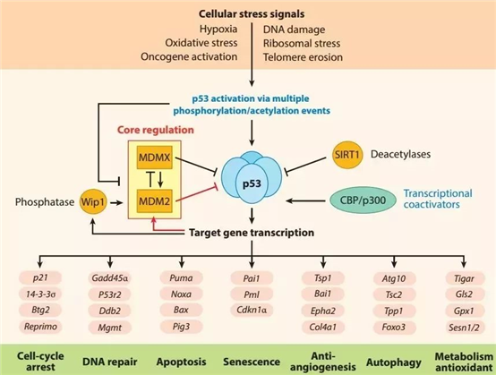 通常情況下,p53蛋白在正常細胞中壽命很短,表達水平也低。但在經(jīng)歷了基因損傷或致癌基因激活時,許多腫瘤細胞表達高水平的突變p53蛋白,在眾多調(diào)控通路中,磷酸化對p53蛋白活性的調(diào)節(jié)起關鍵作用,目前最廣泛被接受的觀點是:當DNA損傷溫和且短暫時,p53主要發(fā)揮促進生存(pro-survival)功能,比如促進細胞周期停滯,促進DNA修復,降低活性氧,提高能量供應等。當DNA損傷難以修復時,p53則會促進死亡(pro-death)的模式,比如誘導細胞衰老,凋亡或者鐵死亡等。