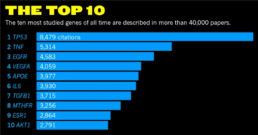 科學家們在癌癥領域做了大量的研究,目前的主要策略是降解突變體p53,或者改造突變體p53的蛋白折疊,使其恢復野生型p53的構(gòu)象和功能。在藥物研發(fā)上,想要抑制一個蛋白的功能容易,想恢復一個蛋白的功能卻很難,所以,到目前為止仍沒有一款靶向p53的抗癌新藥上市,該領域藥物開發(fā)已成為人們最關注的靶點之一,在Nature雜志2017年的一項統(tǒng)計中,TP53基因以絕對優(yōu)勢位列過去幾十年最熱門研究基因榜第一名。