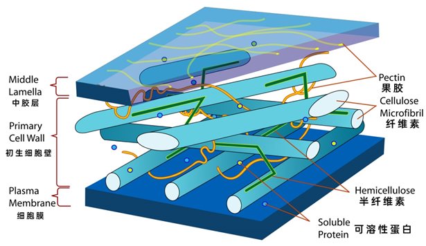 植物細(xì)胞壁由胞間層、初生壁和次生壁構(gòu)成。胞間層又稱中膠層,其主要成分為果膠質(zhì),用于將相鄰細(xì)胞粘連在一起,并可緩沖細(xì)胞間的擠壓。初生壁是由原生質(zhì)體分泌形成的細(xì)胞壁,位于胞間層內(nèi)側(cè),通常較薄,具有較大的可塑性,可使細(xì)胞保持一定形狀,又能隨細(xì)胞生長而延展。次生壁是植物細(xì)胞停止生長后,其初生壁內(nèi)側(cè)繼續(xù)積累的細(xì)胞壁層,位于質(zhì)膜和初生壁之間,通常較厚,約5~10微米,而且堅(jiān)硬,使細(xì)胞壁具有很大的機(jī)械強(qiáng)度。有研究人員發(fā)現(xiàn)細(xì)胞壁上微纖絲的排列方向各層很不一樣,一般初生壁上的微纖絲多呈不規(guī)則交錯(cuò)的網(wǎng)狀,而在次生壁上則往往比較有規(guī)則。